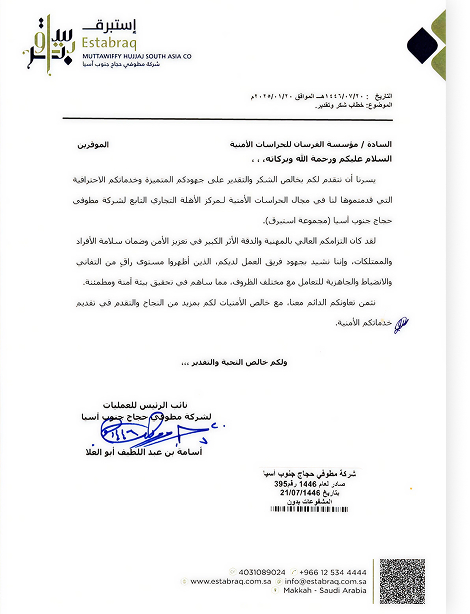 شهادة شكر وتقدير من شركة مطوفي حجاج جنوب آسيا